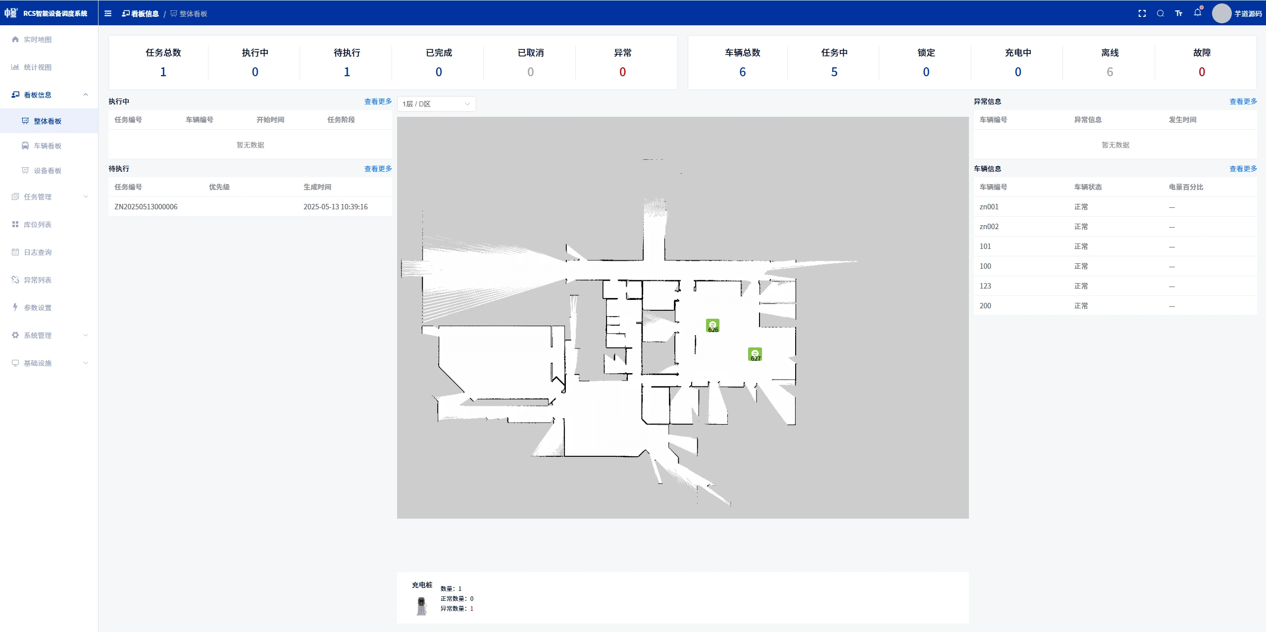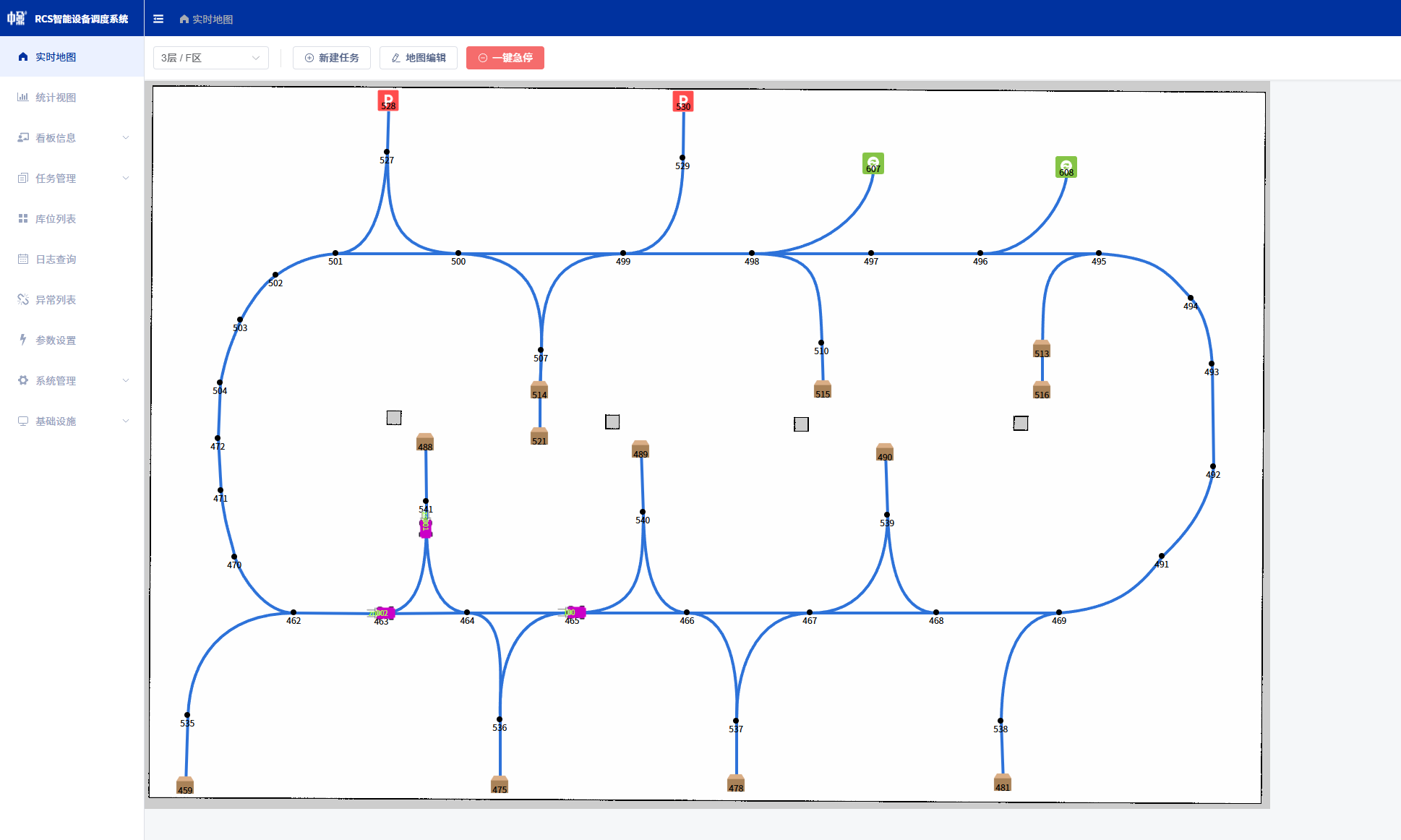 实时展示库区库位信息、AGV运行状态、位置、路径、任务状态、设备状态异常信息